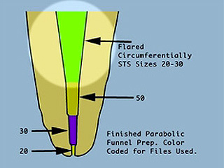 It is prepared with circumferential filing with the Fine-Cut Endo Handpiece using Fine-Cut SPeed files. Generally "V"-filing is used.