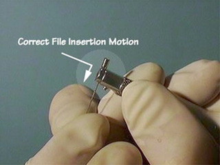 To stabilize the file, simply slide your fourth finger forward. There is too little movement to injure the finger or to cut through the rubber glove.